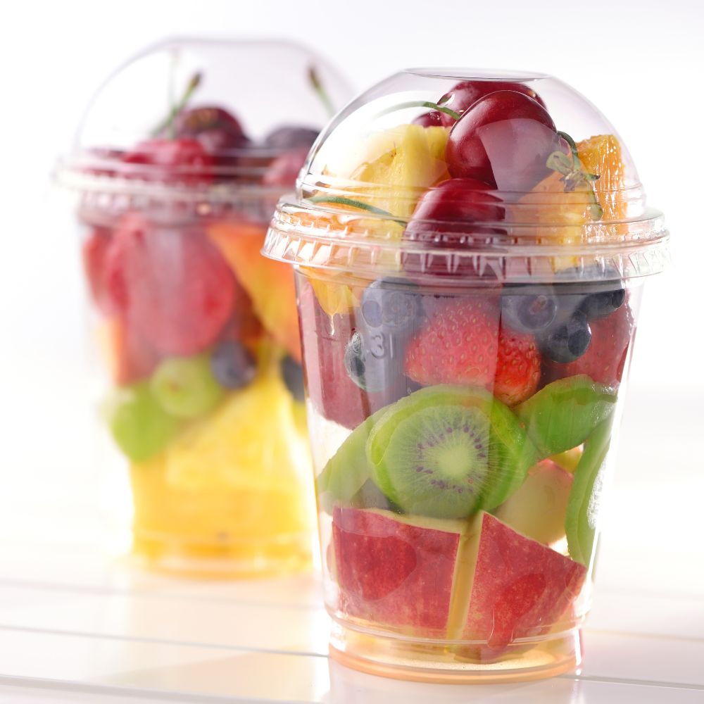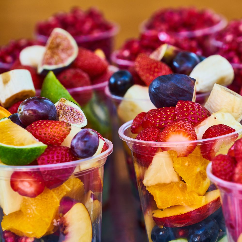 Fresh, seasonal fruit beautifully cut and served in individual cups—perfect for a healthy and refreshing treat.